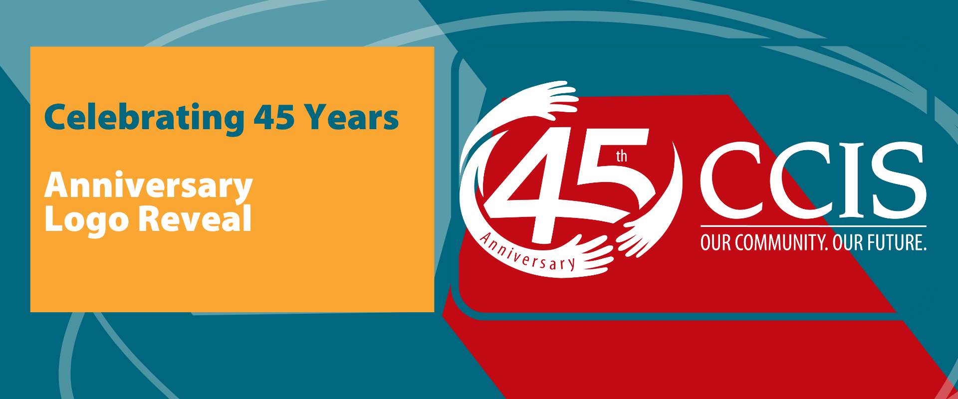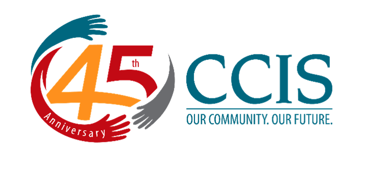 The CCIS 45th Anniversary logo represents unity, support, and integration through three stylized arms embracing the number 45, symbolizing protection and guidance for newcomers. The institutional colors reflect diversity, strength, and hope, while the circular composition conveys community and continuity. The clean, solid typography reinforces the organization’s institutional presence and its 45-year commitment to building futures.