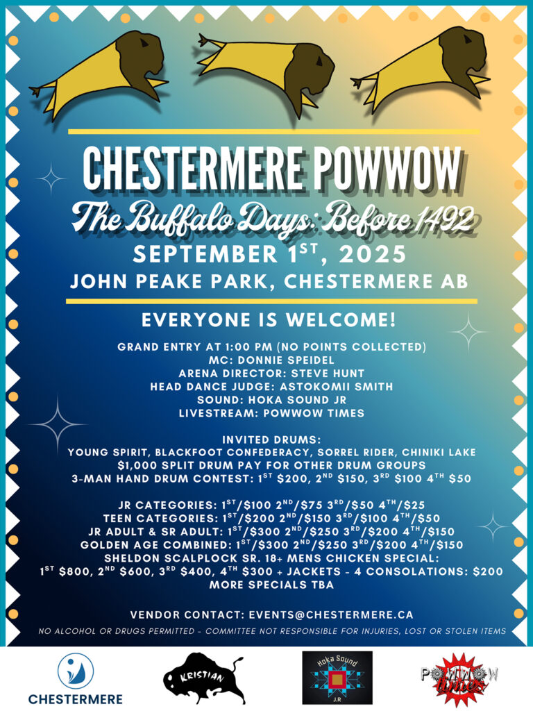 Never been to a Pow WOW…you are in for a treat! The Town of Chestermere has evolved around a 1000-acre man-made reservoir built by the Canadian Pacific Railway in 1980. Travel for 20 minutes East on Highway #1 and you have arrived! This year the town, in partnership, is presenting the Chestermere Pow Wow on September 1st at John Peake Park starting at 1pm with the Grand Entry. Open to all, it is expected to be a spectacular event!