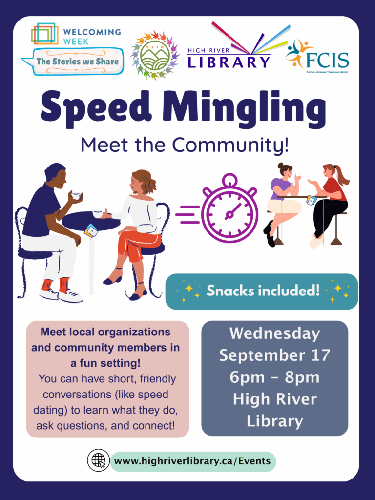 Situated along the Cowboy Trail, and home to many farming and ranching families, High River is known for being the primary filming location for the Heartland series since 2007. Who knew?! Join the FCIS and FLIP staff during Welcoming Week as the High River Public Library hosts the “Speed Mingling” event on September 17th from 6-8pm. Let’s welcome new friends and old, at this unique event that is sure to be filled with laughter.